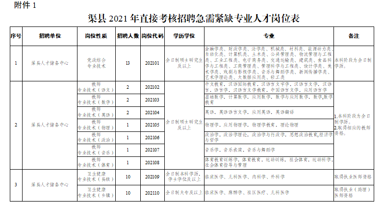 附件:1.渠縣2021年直接考核招聘急需緊缺專業(yè)人才崗位表